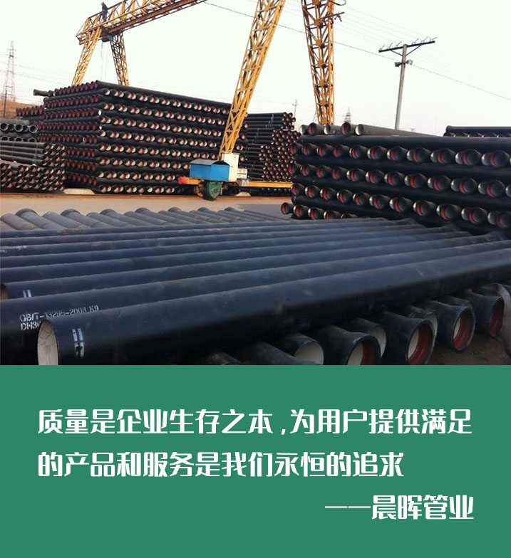 晋城市晋铸晨晖管业有限公司是一家集采矿、选矿、烧结、炼铁、铸造为一体的大型集团公司,三座冶炼高炉,十台离心机组,三台退火炉及五条自动化精整线,总投资十亿元人民币。主要生产球墨铸铁管、柔性铸铁排水管、球墨铸铁配件、球墨铸铁井盖。总体年生产能力超五十万吨。其中球墨铸铁管年生产能力二十万吨,规格:DN80mm-DN2600mm;柔性铸铁排水管年生产能力十万吨,规格DN50mm-DN300mm;球墨铸铁配件年生产能力十万吨,规格DN80mm-DN2600mm;球墨铸铁井盖年生产能力十万吨。